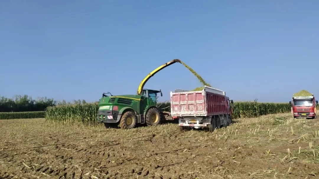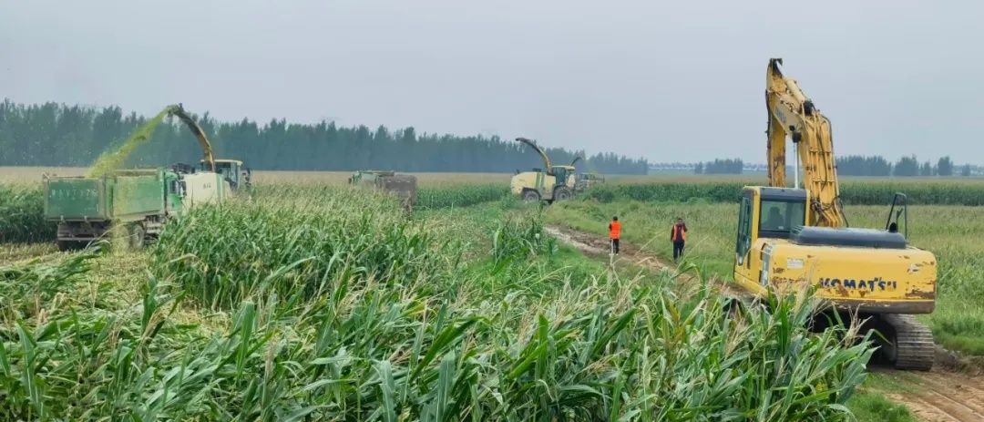 面对困境,农场主要领导果断调整策略,多措并举打响“泥泞攻坚战”。一是人机齐上,昼夜轮战:利用一切降雨间隙,所有可调用大型收割机全部投入,根据地块条件24小时不间断作业,人歇机不歇,全力抢收成熟籽粒。二是双线出击,变通减损:对机械难以下地的泥泞田块,则采用“籽粒与青贮同步收”的策略。一时间,运输玉米籽粒与青贮饲料的车辆往来穿梭,最大限度地将粮食和饲料“抢”出田间。三是重器护航,开路前行:平日里用于工程的挖掘机、大型铲车化身“田间开路先锋”,清沟、铺路、救援陷车,为收割机群扫清障碍,构筑起一条条泥泞中的生命线。